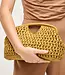 *Exterior Details: Handwoven clutch silhouette in textured straw with a structured shape, detachable chain shoulder strap, and gold-tone hardware