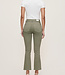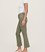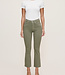 Fern is a warm, green denim. It features faux front pockets, a brushed silver shank and matte copper rivets, tonal stitching, a raw hem and an ecru back patch.