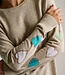 100% Cotton Sweater · Rolled edge crew neck pullover · Raglan sleeve with multi contrast heart intarsia · Rib trim · Model is 5'9” and is wearing size small.