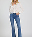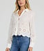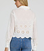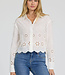 This elegant button-up long sleeve embroidered crop shirt in riviera white offers a relaxed fit with a stylish scallop hem and button front, enhancing its fashionable appeal.