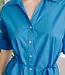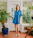 The Shannon Dress is an effortless t-shirt dress in a striking palace blue, featuring a relaxed button-down front and adjustable tie-details at the waist and sleeves.
