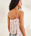 Adjustable spaghetti strap top. V-neck. Embroidered detail on the front and buttons at the back. Ruffled hem.