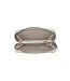 *Exterior Details: woven textured front panel accented with gold-tone shell and round studs, framed by smooth stitched trim and a compact profile that fits in small bags.